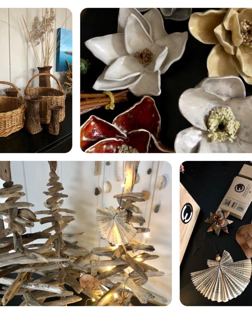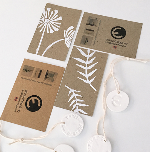 Også et visittkort på resirkulert papir og en tagg i keramikk